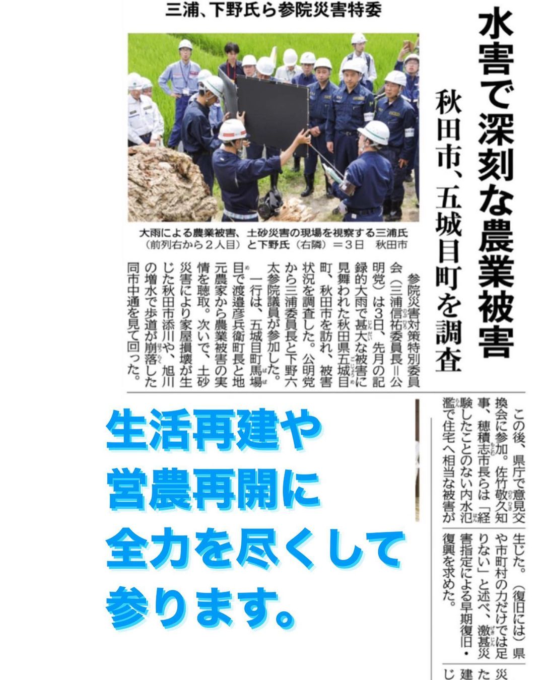 生活の再建、営農の再開に向けて必要な措置を講じて参ります。秋田の皆様が希望をもって日常生活を送ることができるように全力で支援させていただきます。