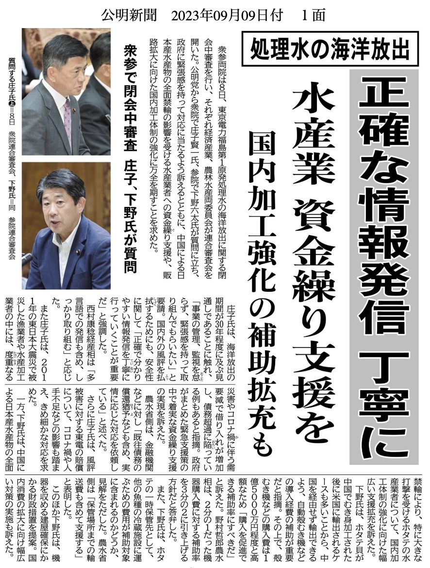 2023年9月9日 閉会中審査:処理水海洋放出関連・水産業資金繰り支援