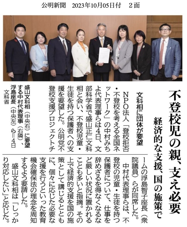 2023年10月5日 文科相提言:不登校児の親支援