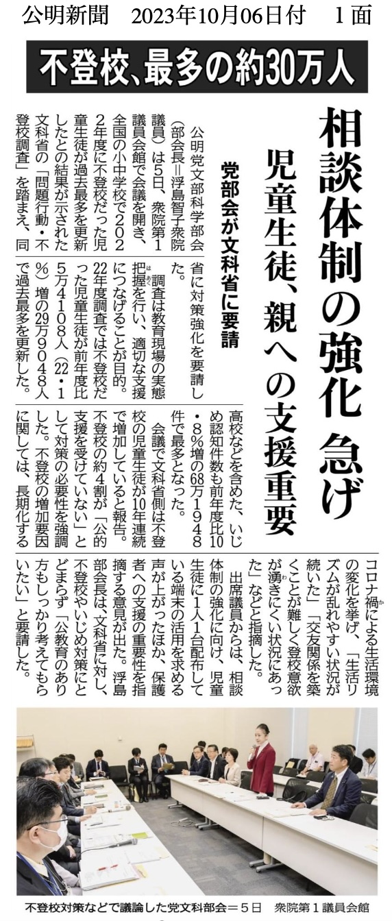 2023年10月6日 文科省提言:不登校児相談体制の強化