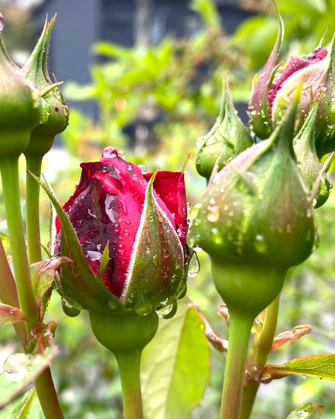 今朝のわが家のバラです。まもなく開花しそうですが、バラのつぼみは昨日からの雨が喜びとなっているようです。私にはバラが喜んでいるように見えます。
